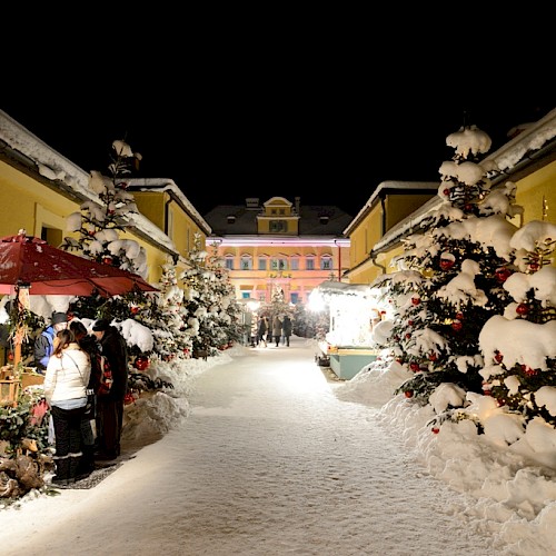 Hellbrunner Adventzauber (c) Gassner Gastronomie, Foto Zauner: The image captures the enchanting Hellbrunn Christmas Market set against the majestic backdrop of Hellbrunn Palace. Snow-covered trees and festively decorated stalls create a magical winter atmosphere, as visitors stroll through the warmly lit courtyard. The palace itself is beautifully illuminated and transformed into a giant advent calendar, adding a unique festive charm. This idyllic scene, with twinkling lights and seasonal cheer, offers the perfect setting to enjoy mulled wine, local crafts, and holiday treats in a fairytale-like ambiance.